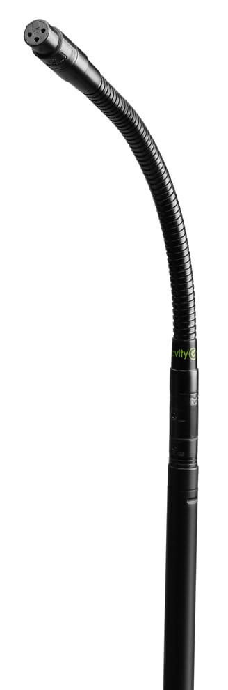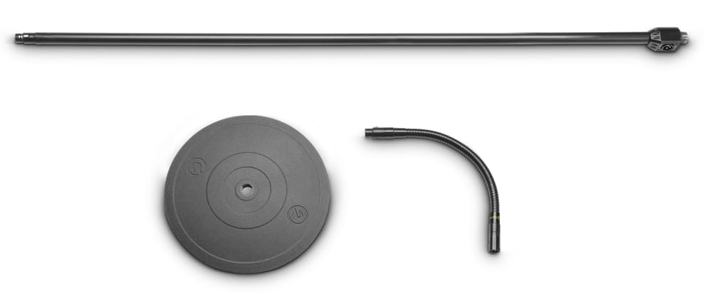 - Statyw do mikrofonu z wbudowanym, wewnętrznie poprowadzonym złączem XLR i odłączaną gęsią szyjką