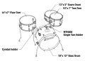 Zestaw nie zawiera talerzy, pedału stopy ani statywów widocznych na zdjęciu. Dokładna konfiguracja wypisana jest poniżej i jest również widoczna na ostatnim diagramie.